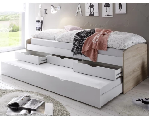 Postel se 3 úložnými zásuvkami a přídavným výsuvným lůžkem pro příležitostné spaní v dolní části konstrukce. Najde praktické využití v jakémkoliv dětském pokoji