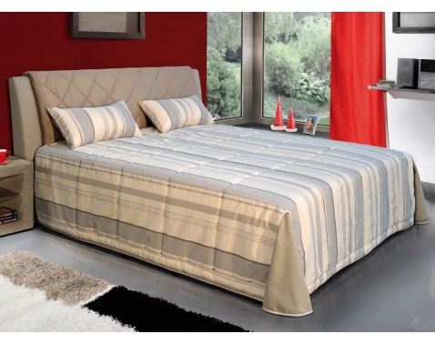 Luxusní manželská postel s prošívaným čelem obsahuje komfortní vysoké matrace, rošty i rozměrné úložné prostory ve spodní části. Očalouněna béžovou látkou.