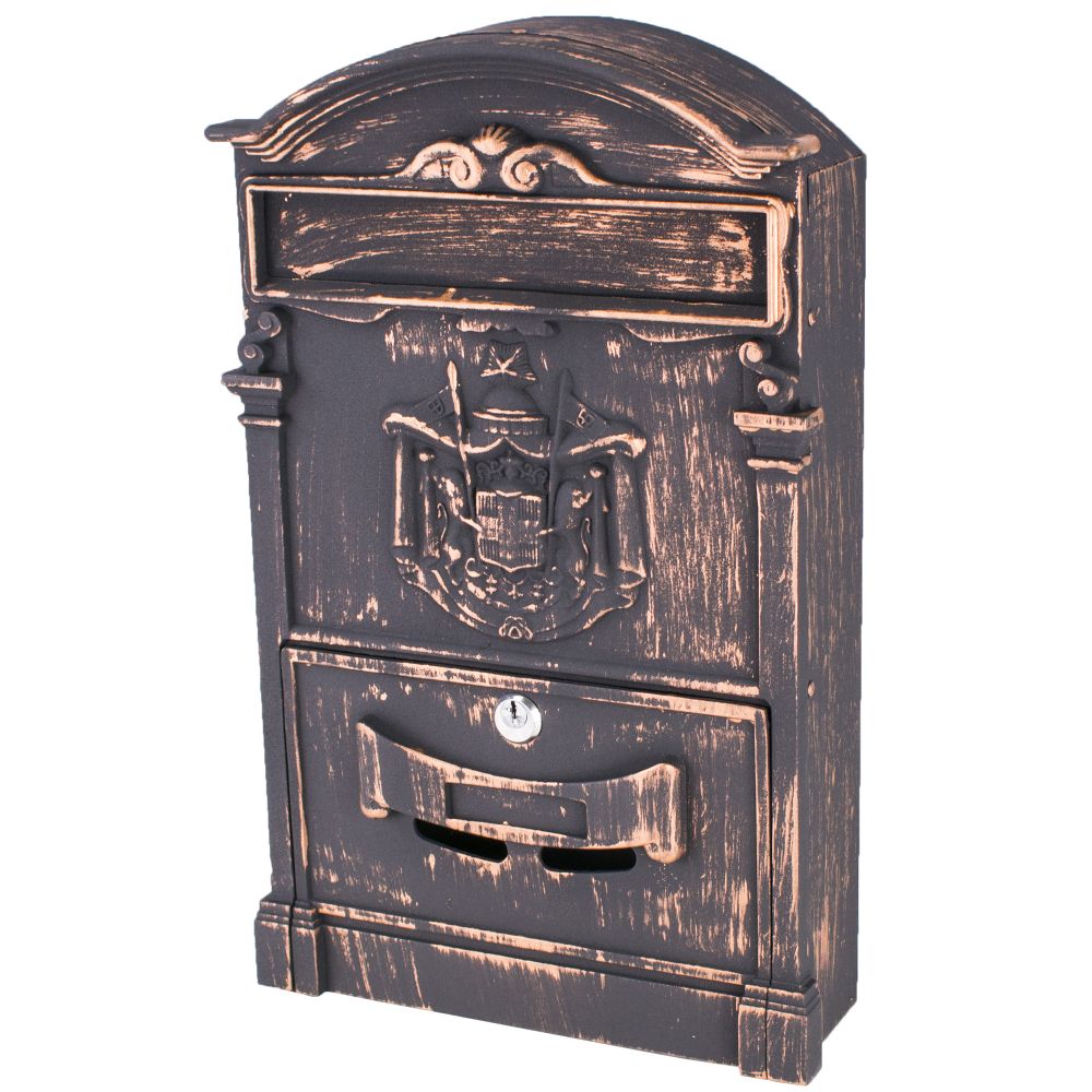Poštovní schránka vyrobená z kombinace ocelového plechu a hliníkové slitiny. Celé schránka je opatřena kvalitním lakem imitujícím léty opotřebovanou měď. Schránka je opatřena cylindrickým zámkem proti vniknutí a průhledem. Tato poštovní schránka je určena jak do interiéru, tak hlavně do exteriéru. Montážní sada ( hmoždinky a vruty ) je součástí balení. Celkové rozměry:36,5 x 36,5 x 13,5 cm ( Š x V x H )Materiál schránky:ocelový plech + hliníkPovrchová úprava:prášková barva ( komaxit )Barva:antická měďPřídavný box:neVhoz:na čelní straně, krytýPočet klíčů:2