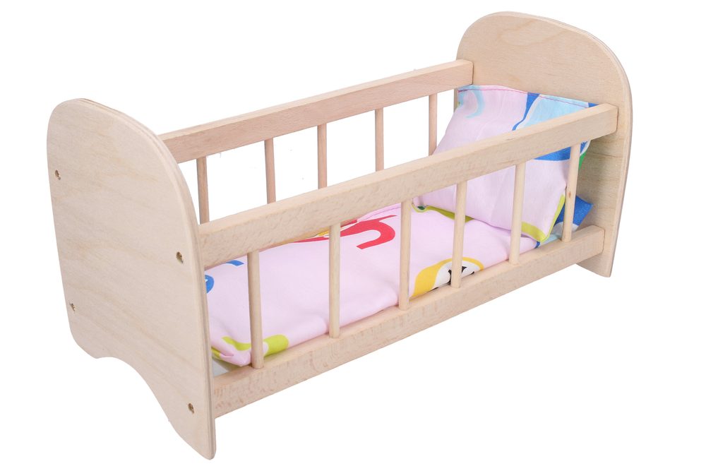 Dřevěná postýlka je ideálním pomocníkem každé malé maminky, stačí přidat nadýchané peřinky a miminko uložit ke spánku. Rozměry: 30 x 15 cm