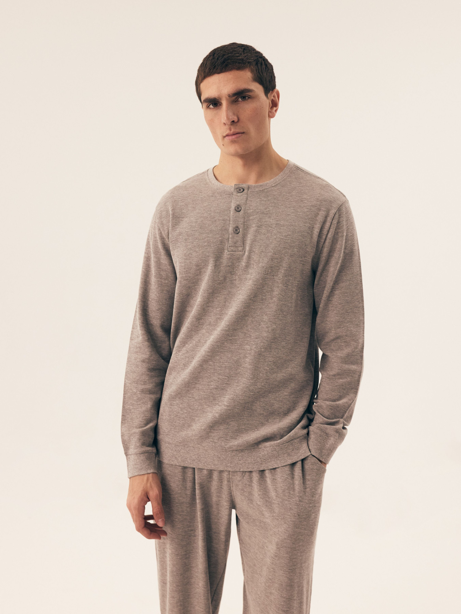 Halenka s dlouhými rukávy Knoflíky rozepnuté Ideální také jako domácí oblečení Volný, pohodlný střih Měkká a vzdušná tkanina Model je k dispozici v mnoha barvách nebo vzorech Nohavice s žebrovaným lemem Prošívaná tkanina Rukávy s žebrovaným lemem Stahovací šňůrka v pase Elastický pas