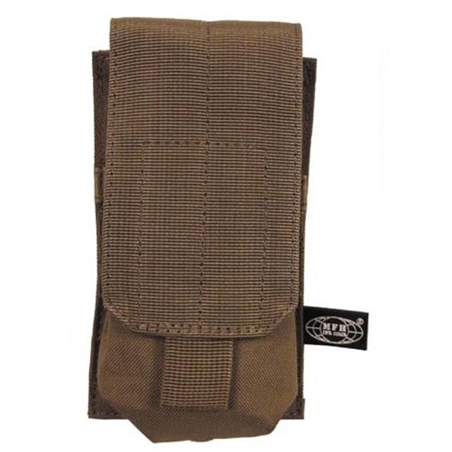 Pouzdro modulárního systému MOLLE na jeden zásobník Zásobník je jištěn proti vypadnutí chlopní na suchý zip. Pouzdro je možné díky polohovatelné chlopni upravit pro různé délky zásobníku. Přes pouzdro je našitý široký pás pruženky, který stahuje prostor pro zásobník, a tím je v pouzdře lépe fixován. Pro upevnění k opasku, či jiné součásti výstroje, slouží dva pásky rozepínatelné na jedné straně kovovým patentem. Rozměry: 9 x 16 x 5 cm Hmotnost: 85 g Výrobce: MFH, Německo