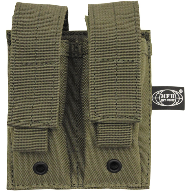 Pouzdro MOLLE na 2 zásobníky malé Zásobník je jištěn proti vypadnutí chlopní na suchý zip Pouzdro je možné díky polohovatelné chlopni upravit pro různé délky zásobníku. Materiál: 100 % polyester Rozměry: celé pouzdro (2 kapsy) 10 × 12,5 × 4 cm (š × v × h) kapsa 4 × 12 × 2,5 cm (š × v × h) Hmotnost: 80 g Výrobce: MFH, Německo Kód výrobce: 30617