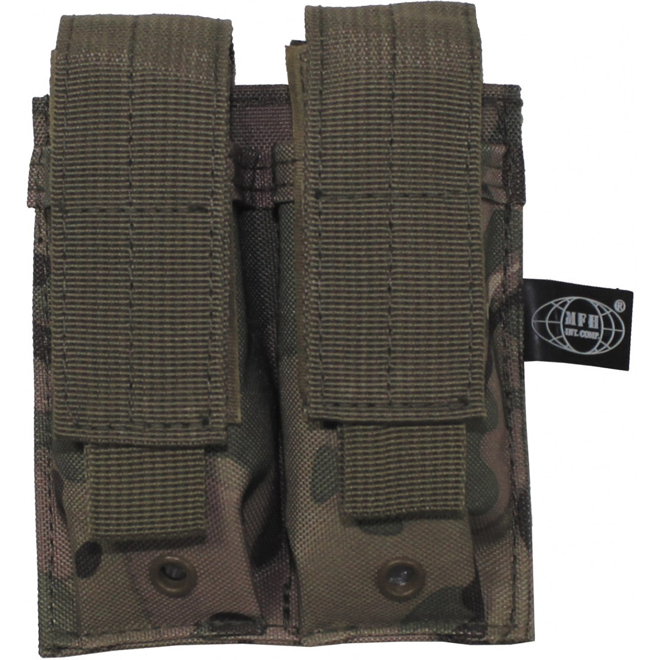 Pouzdro MOLLE na 2 zásobníky malé Zásobník je jištěn proti vypadnutí chlopní na suchý zip Pouzdro je možné díky polohovatelné chlopni upravit pro různé délky zásobníku. Materiál: 100 % polyester Rozměry: celé pouzdro (2 kapsy) 10 × 12,5 × 4 cm (š × v × h) kapsa 4 × 12 × 2,5 cm (š × v × h) Hmotnost: 80 g Výrobce: MFH, Německo Kód výrobce: 30617