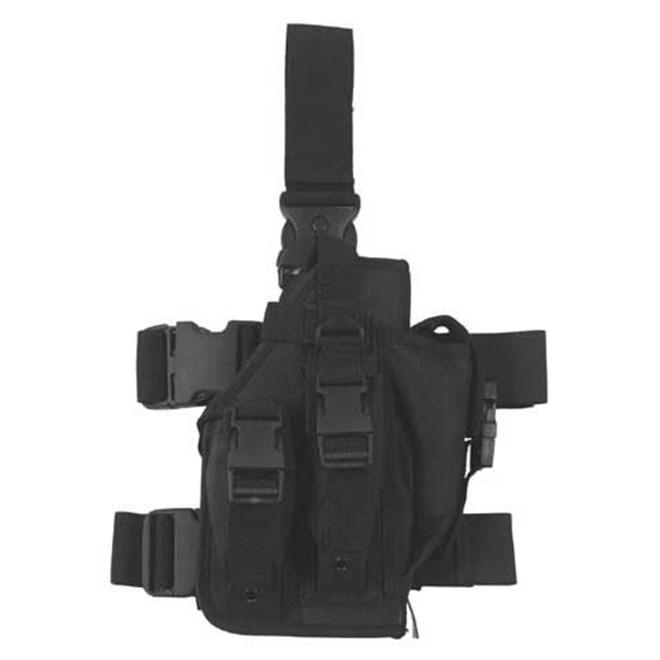 Robustní stehenní pouzdro na zbraň Stehenní pistolové pouzdro vhodné pro většinu pistolí a revolverů Pouzdro je určeno k zavěšení na pravý bok Prostor pro zbraň lze rozšířit i zúžit pomocí suchého zipu našitého uvnitř v zadní polovině pouzdra (pod spouští) Tři pouzdra na zásobník - dvě na přední stěně, třetí po straně. Pouzdra jsou krytá přehybem, jištěným plastovou sponou Pomocí průvleku lze pouzdro zavěsit na opasek. Průvlek je možné rozevřít pomocí suchého zipu a se samotným pouzdrem je spojen plastovou sponou, pouzdro lze tedy odepnout bez nutnosti rozepínat opasek K zafixování pouzdra na stehně slouží dva popruhy zaviratelné plastovou sponou, velikost popruhů lze regulovat Zajišťovací popruh na vrchní části pouzdra má rovněž stavitelnou délku. Je uzavíraný dvěma druky a jištěný suchým zipem Materiál: 100 % polyester Hmotnost: 560 g Výrobce: MFH, Německo