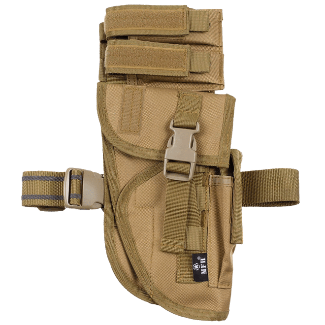 Pouzdro na zbraň – stehenní TACTICAL Stehenní pouzdro TACTICAL je určeno pro nošení krátké zbraně při taktickém nebo služebním použití. Upevnění na stehno zajišťuje rychlý a pohodlný přístup ke zbrani i při dynamickém pohybu. Pouzdro je vybaveno výškově nastavitelným páskem pro uchycení k opasku a nastavitelným stehenním popruhem s přezkou pro pevnou fixaci. Krycí chlopeň se zapínáním na přezku zajišťuje bezpečné uložení zbraně. Součástí jsou také odnímatelné zásobníkové kapsy s uzavíráním na suchý zip. Konstrukce je přizpůsobena pro stabilní nošení, dobré rozložení hmotnosti a rychlou manipulaci. Základní vlastnosti: stehenní provedení nastavitelný opaskový úchyt nastavitelný stehenní popruh s přezkou krycí chlopeň se zapínáním odnímatelné zásobníkové kapsy stabilní a bezpečné uchycení barva: okrová / olivová / černá