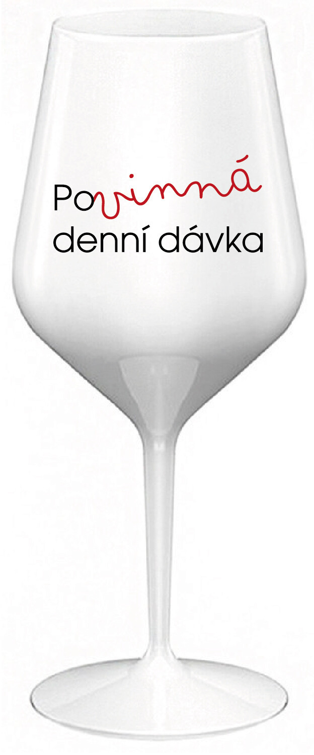 Nerozbitná bílá vinná sklenice s motivem POVINNÁ DENNÍ DÁVKA je skvělá na zahradu, pláž, výlet, piknik a parádu udělá i při kempování. Jelikož je vyrobená z kvalitního polykarbonátu je de facto nerozbitná. Je to luxusní kousek, s nímž si víno můžete vychutnat prostě kdekoliv. Mají ergonomický tvar, který příjemně padne do ruky a protože je lehká, usnadňuje to její přenášení. Je snadno skladovatelná a lehce se čistí. Díky svému designu si s ní můžete vychutnat doopravdy kdekoliv bezproblémové pití výborného vína. Materiál PP. Vyrobené s láskou v ČR