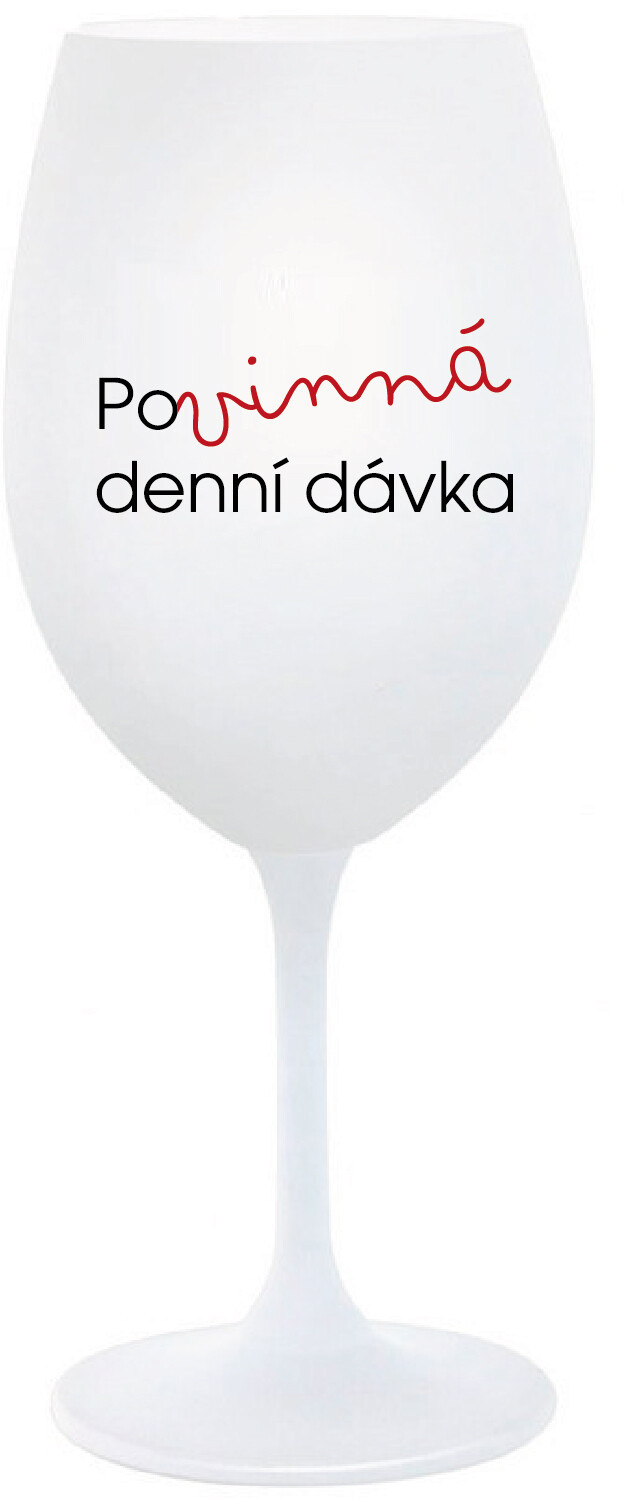 Vinná bílá sklenice s originálním motivem POVINNÁ DENNÍ DÁVKA je krásným a osobitým dárkem, které ale využijete i Vy sami třeba ve chvílích, kdy si budete chtít zpříjemnit náročný den. Tyto originální vinné sklenice jsou totiž nejen pro výjimečné události, ale i pro běžné večery, které si chcete zpříjemnit sklenkou dobrého vína. Jistě proto potěší každého milovníka vína, i toho, kdo si umí svůj život vychutnat plnými doušky. Materiál sklo. Vyrobené s láskou v ČR