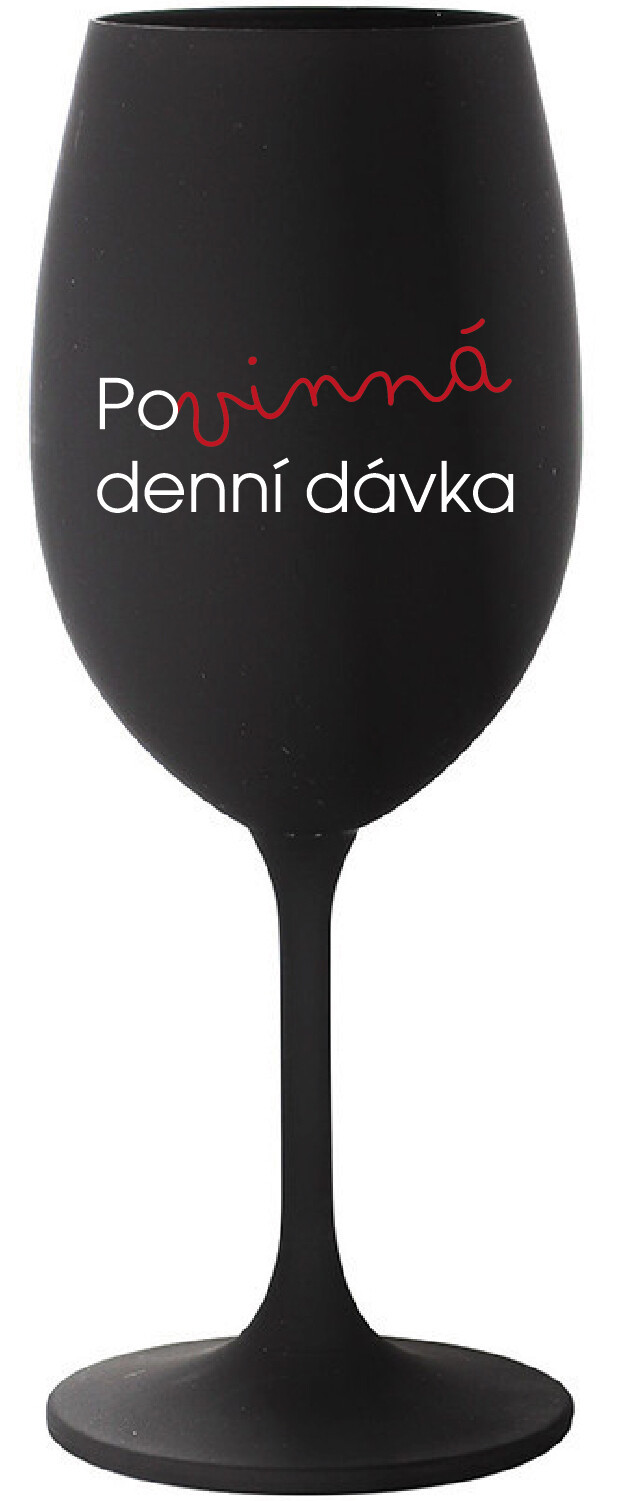 Vinná černá sklenice s originálním motivem POVINNÁ DENNÍ DÁVKA je krásným a osobitým dárkem, které ale využijete i Vy sami třeba ve chvílích, kdy si budete chtít zpříjemnit náročný den. Tyto originální vinné sklenice jsou totiž nejen pro výjimečné události, ale i pro běžné večery, které si chcete zpříjemnit sklenkou dobrého vína. Jistě proto potěší každého milovníka vína, i toho, kdo si umí svůj život vychutnat plnými doušky. Materiál sklo. Vyrobené s láskou v ČR