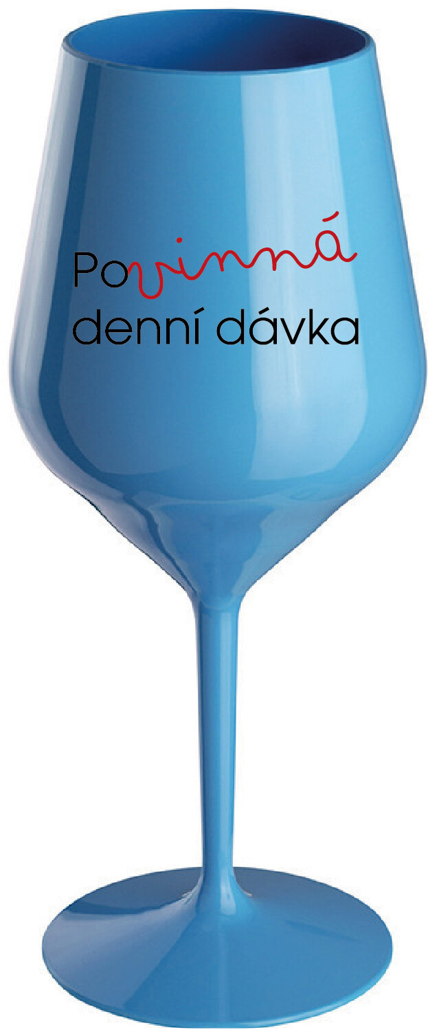 Nerozbitná modrá vinná sklenice s motivem POVINNÁ DENNÍ DÁVKA je skvělá na zahradu, pláž, výlet, piknik a parádu udělá i při kempování. Jelikož je vyrobená z kvalitního polykarbonátu je de facto nerozbitná. Je to luxusní kousek, s nímž si víno můžete vychutnat prostě kdekoliv. Mají ergonomický tvar, který příjemně padne do ruky a protože je lehká, usnadňuje to její přenášení. Je snadno skladovatelná a lehce se čistí. Díky svému designu si s ní můžete vychutnat doopravdy kdekoliv bezproblémové pití výborného vína. Materiál PP. Vyrobené s láskou v ČR