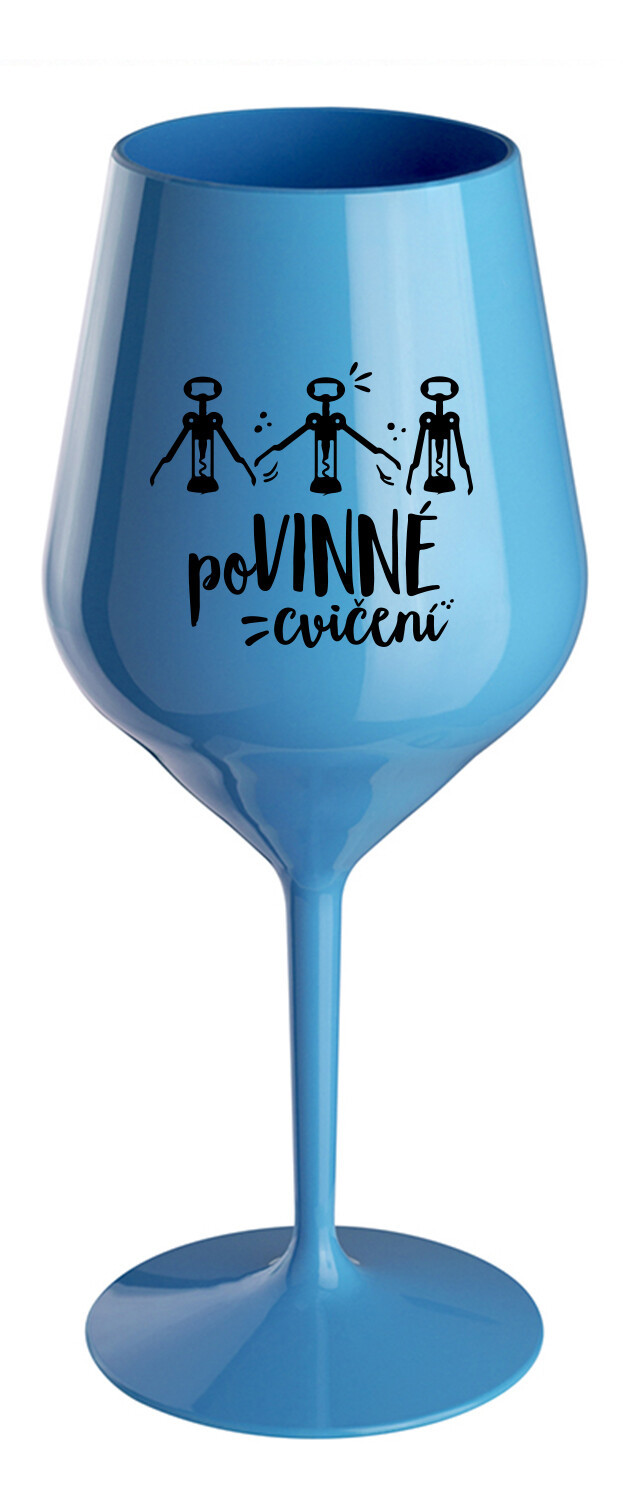 Nerozbitná modrá vinná sklenice s motivem POVINNÉ CVIČENÍ je skvělá na zahradu, pláž, výlet, piknik a parádu udělá i při kempování. Jelikož je vyrobená z kvalitního polykarbonátu je de facto nerozbitná. Je to luxusní kousek, s nímž si víno můžete vychutnat prostě kdekoliv. Mají ergonomický tvar, který příjemně padne do ruky a protože je lehká, usnadňuje to její přenášení. Je snadno skladovatelná a lehce se čistí. Díky svému designu si s ní můžete vychutnat doopravdy kdekoliv bezproblémové pití výborného vína.