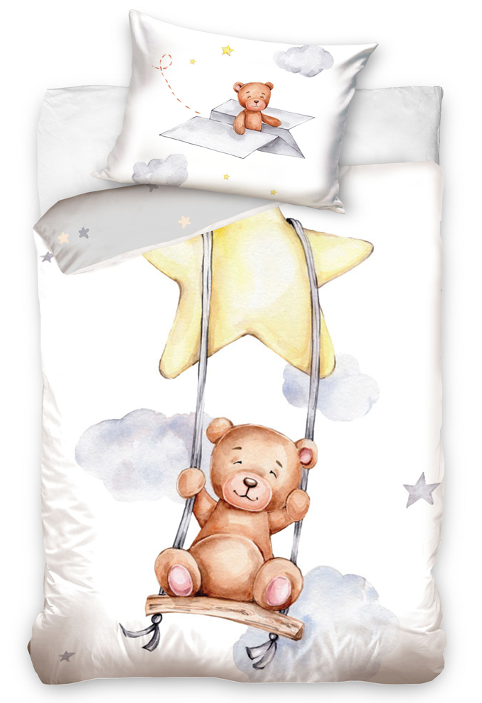 Postýlkové povlečení s plyšovým Medvídkem Povlečení do postýlky Medvídek Houpačka na Hvězdě je vyrobeno ze 100% bavlny Renforcé Postýlkové povlečení má rozměry peřinky 100x135 cm a polštářku 40x60 cmNa lícní straně povlaku přikrývky je roztomilý, plyšový medvídekMedvídek se houpe na dřevěné houpačce, která je zavěšená na žluté hvězdičceReverzní strana povlaku přikrývky je šedá a na ní jsou malé hvězdičkyPovlak polštářku je z obou stran stejný a na něm medvídek, který letí v papírové vlaštovcePovlečení vlastní certifikát Oeko-Tex Standard 100 Vhodné barvy prostěradel tomuto povlečení budou v bílé, béžové a šedé Bavlněné povlečení perte vždy z rubu, se zapnutým zipem, dle symbolů uvedených na obaleNepoužívejte prací prostředky s obsahem bělících a rozjasňujících substancíPovlečení odstřeďujte při menších otáčkách, aby nedošlo k trvalému poškození bavlněných vláken Odstíny barev obrázků se mohou lehce lišit v závislosti na nastavení Vašeho monitoru