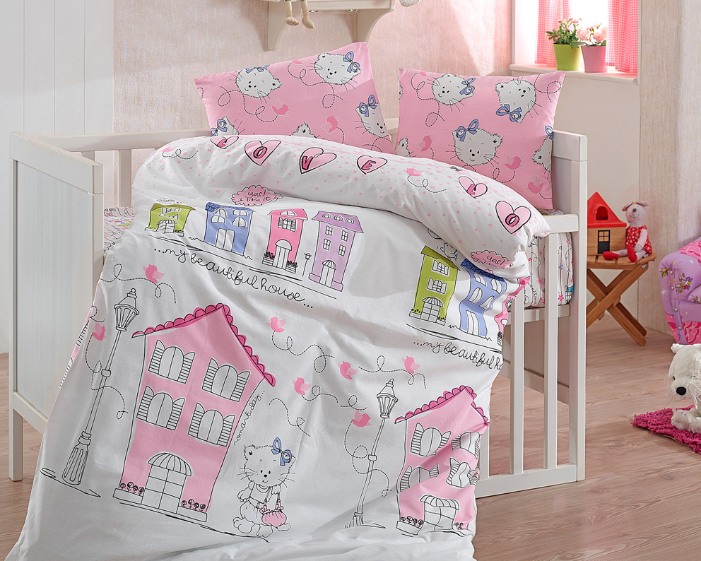 Růžové povlečení do postýlky s kočičkou Povlečení pro malé děti, především holčičky je bílé barvy s barevnými domečky a kočičkou Miou, která je ještě vyobrazena na růžovém polštářiSada obsahuje 1 povlak na polštář 1 povlak na přikrývkuPovlečení do postýlky je vyrobeno ze 100% bavlny a jeho rozměry jsou 100x135/ 40x60 cmDětské povlečení je opatřeno zipemDoporučená barva prostěradel je bílá, růžová, fialková, limetková Povlečení perte vždy z rubu, se zapnutými zipovými uzávěry, dle symbolů uvedených na obaleNepoužívejte prací prostředky s obsahem bělících a rozjasňujících substancíOdstřeďujte při nižších otáčkách, aby nedošlo k polámání, a tak k trvalému poškození bavlněných vláken Odstíny barev obrázků se mohou barevně lišit, v závislosti na nastavení Vašeho monitoru