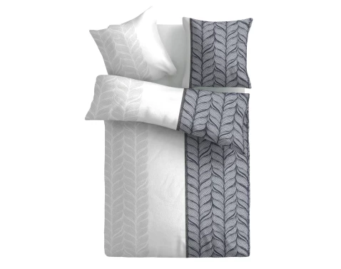 Moderní ložní povlečení z příjemného bavlněného saténu v bílé, šedé a modré barvě se zajímavým vzorem připomínající listy Vám poskytne dokonalý spánek a odpočinek. Měkká a hebká látka, která chladí i hřeje zároveň, je perfektní volbou pro skvělé usínání. Rozměr 140x220 cm.