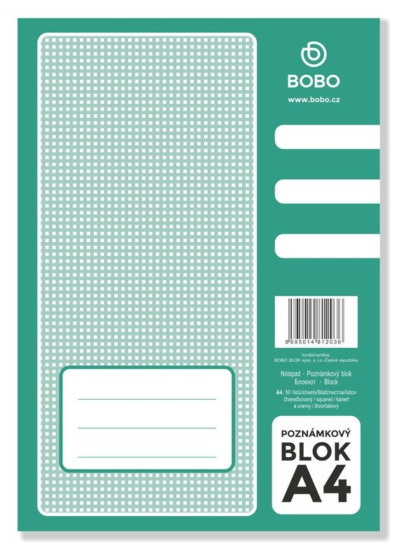 Skvělý pomocník pro každodenní život. Do práce, do školy i na doma. br brLepený poznámkový blok s čtverečkovanými listy z bezdřevého papíru je vhodný do školy i kanceláře, především na rychlé poznámky. Díky lepené vazbě se listy z bloku snadno odtrhávají. br brBlok A4 br• Formát: A4 br• Lineatura: čtverečkovaná br• Počet listů: 50 br• Papír: 70g/m2 br• Vazba: lepená, horní