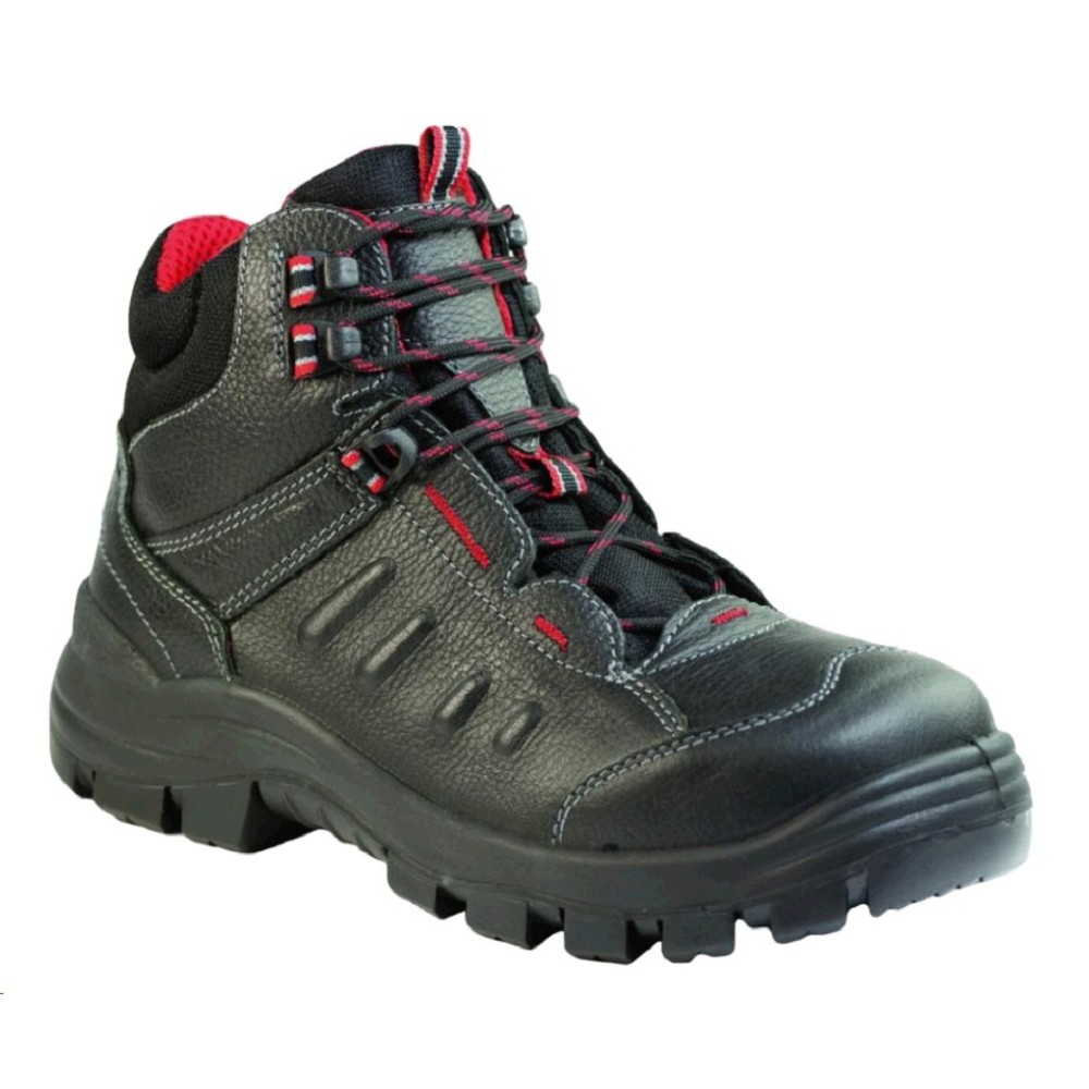 Obuv TOBIAS S3 S93873 pánská kotničková černá Kvalitní a komfortní bezpečnostní kotníková obuv s pryžovým nášlapem, plastovou tužinkou, kevlarovou planžetou a ochranou proti okopu, bez kovových součástí, se svrškem s hydrofobní úpravou vhodná k venkovnímu využití. Hlavní přednosti: odolnost proti průniku vody odolnost proti uklouznutí absorpce energie v oblasti paty obuv NON METALLIC bez kovových součástí odolnost proti palivovým olejům odolnost proti kontaktnímu teplu do 300°C antistatická obuv bezpečnostní tužinka odolnost proti propíchnutí Barva: černá Tužinka: extra široká kompozitní 200 J Stélka: kevlarová našívací Vrchový materiál: hovězinová useň BURTON PRINT s hydrofobní úpravou v síle 2,0-2,2 mm Podšívka: oděruvzdorný prodyšný textilní materiál a paropropustností 71 mg/hod Vkládací stélka: anatomicky tvarovaná stélka DRY-SOLE Mezipodešev: lehčený polyuretan s hustotou max 0,45 g/cm3 Podešev: protiskluzová podešev GR-66 PU/PRYŽ Výrobní způsob: přímý nástřik Velikost: 36-48