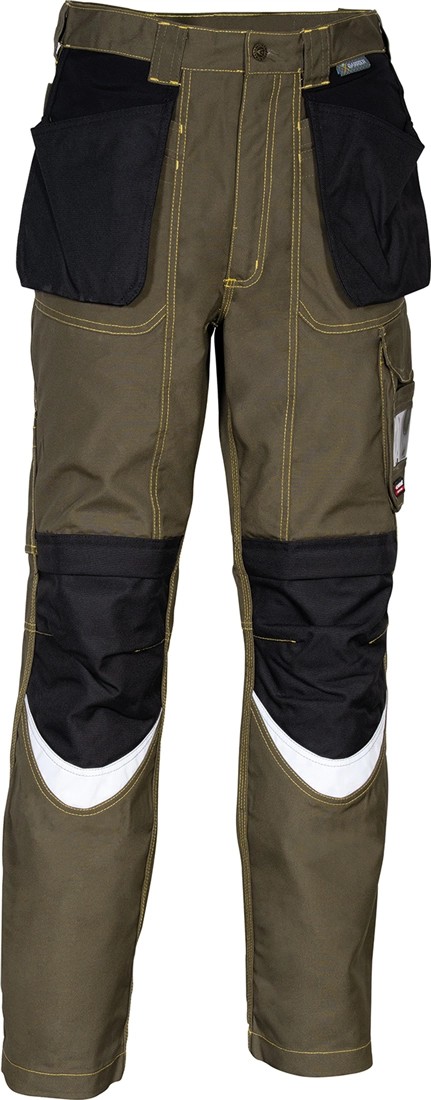 • 4 široké přední kapsy, zesílené v rozkroku, 2 zadní kapsy, jedna z nich s patkou, 3M ™ Scotchlite ™ Reflexní materiál reflexní vložky - 8910 stříbrnou látkou, nastavitelné poutko na kladivo, kolena a nohy ergonomický design, boční kapsa,kapsa, CORDURA ® vnější kapsy, CORDURA ® nastavitelné kolenní kapsy, v pase, YKK ® zip