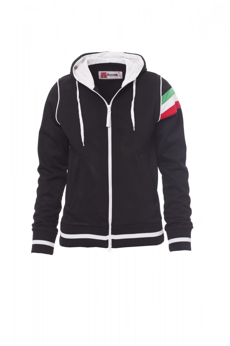 Dámská vyštíhlená mikina s kontrastním plastovým skrytým celozipem s dvojitým kovovým jezdcem, kapuce se stahovací šňůrkou, vnitřek kapuce a stahovací šňůrka kontrastní barvy, manžety a pas s elastickým žebrováním, kontrastní lemování průramků, levý průramek v barvách italské trikolóry, dvě kapsy na zip, zesílené švy, simil piké tkanina na vnější straně pro vyšší prodyšnost.