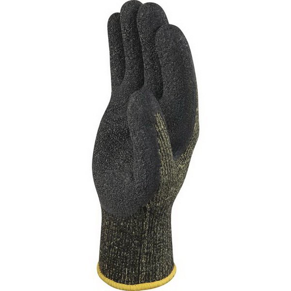 Bavlna/polyester/paraaramid. Dlaň a prsty povrstvené zdrsněným latexem. Hustota úpletu 10. Podklad: polybavlna/paraaramid. Povlak: přírodní latex.