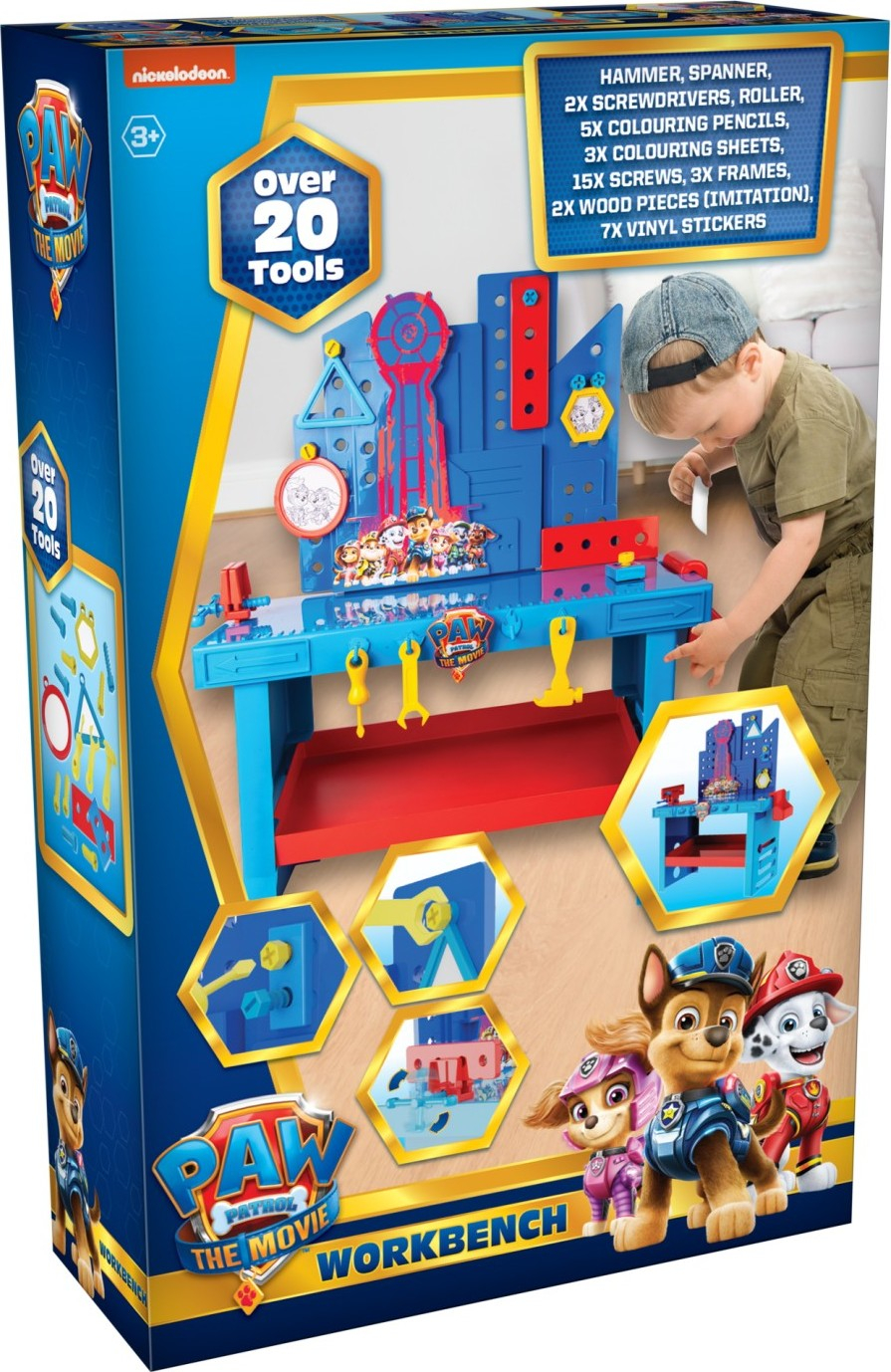 Pracovní stůl kutili Tlapková Patrola s 20 nástroji! Balení obsahuje – stůl s velkou pracovní ploucho a zády, šroubovák, kladívko, klíč, 2 válečky, 5 pastelek, 3 omalovánky, 10 šroubů, 2 ks dřeva a 5 samolepek. Rozměr stolu je 46×32×78 cm.