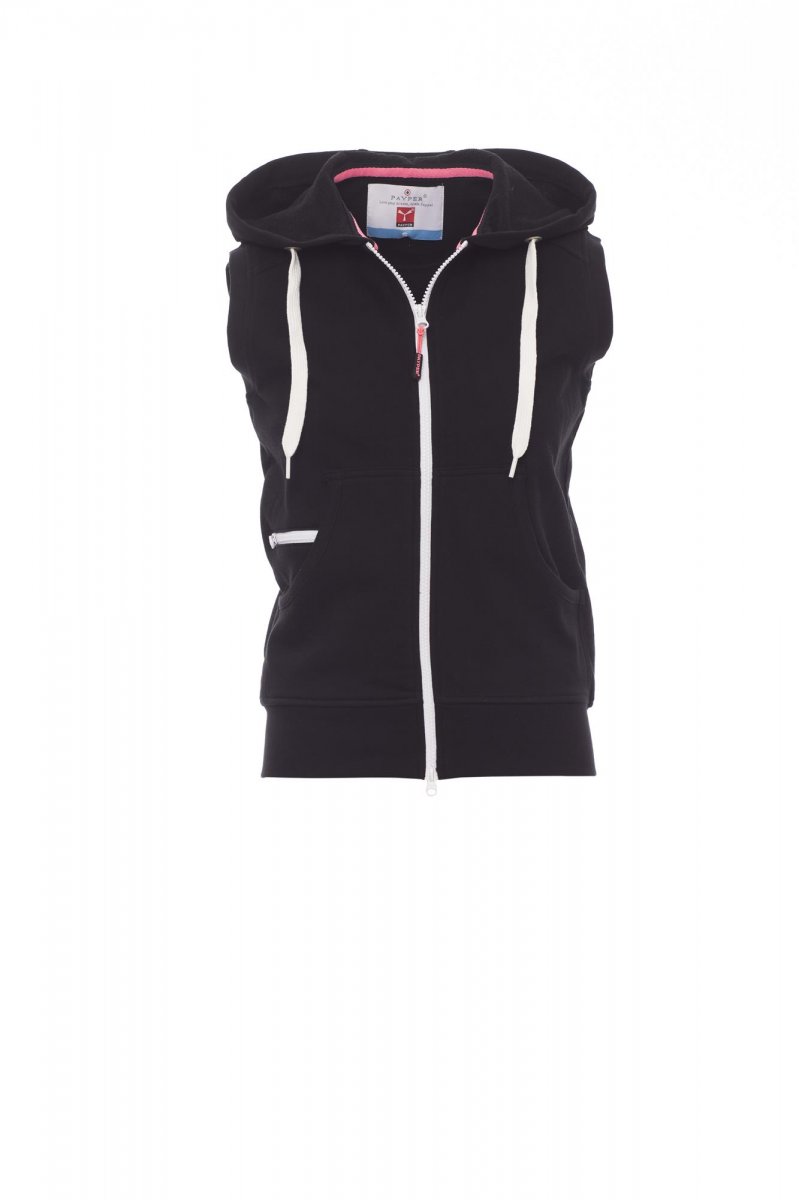 Dámská vesta s plastovým celozipem v kontrastní barvě, s dvojitým kovovým jezdcem, tvarovaná kapuce a stahovací šňůrka kontrastní barvy, klokaní kapsa s kapsičkou na zip.