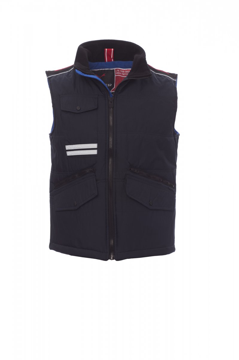 Unisexová vesta s 8mm plastovým zipem s kovovým jezdcem zakrytým klopou s plastovými knoflíky, tvarovaná zadní část, dvě vnějšíí kapsy s LOCK SYSTEMem, dvě kapsy na zip, šikmé kapsy pro lepší přístup, jedna kapsa na hrudi na smartphone a upínací kroužek na jmenovku, reflexní pruhy na kapsách a na zádech. Vnitřek: zateplení, kontrastní flísový lem na zádech a límci, jedna vnitřní kapsa, zip pro snadnější pětisk a vyšívání.