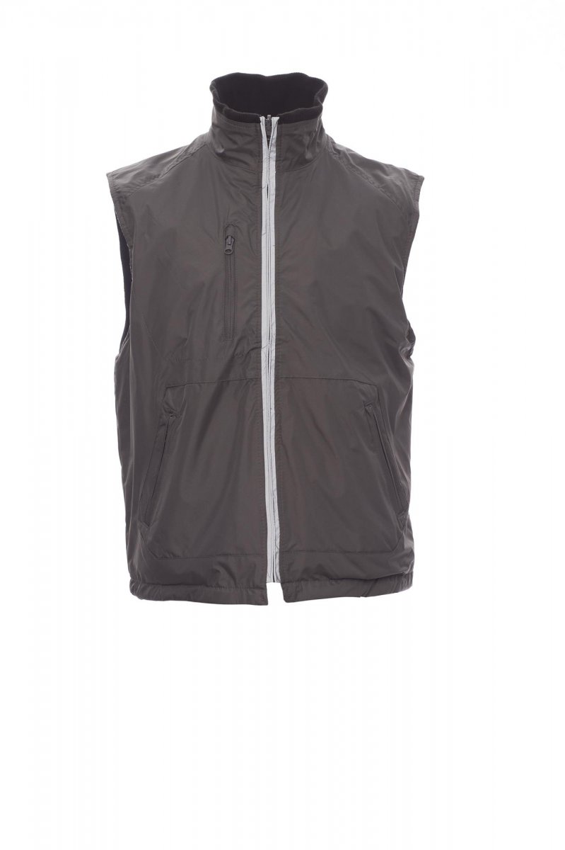 Unisexováoboustranně vesta, skrytý plastový zip s reflexním lemováním, stahovací šňůrka v pase, tři vnějšíí kapsy. Vnitřek: flísová podšívka, žebrovaný úplet na límci, dvě kapsy na hrudi na zip pro snadnější pětisk a vyšívání.