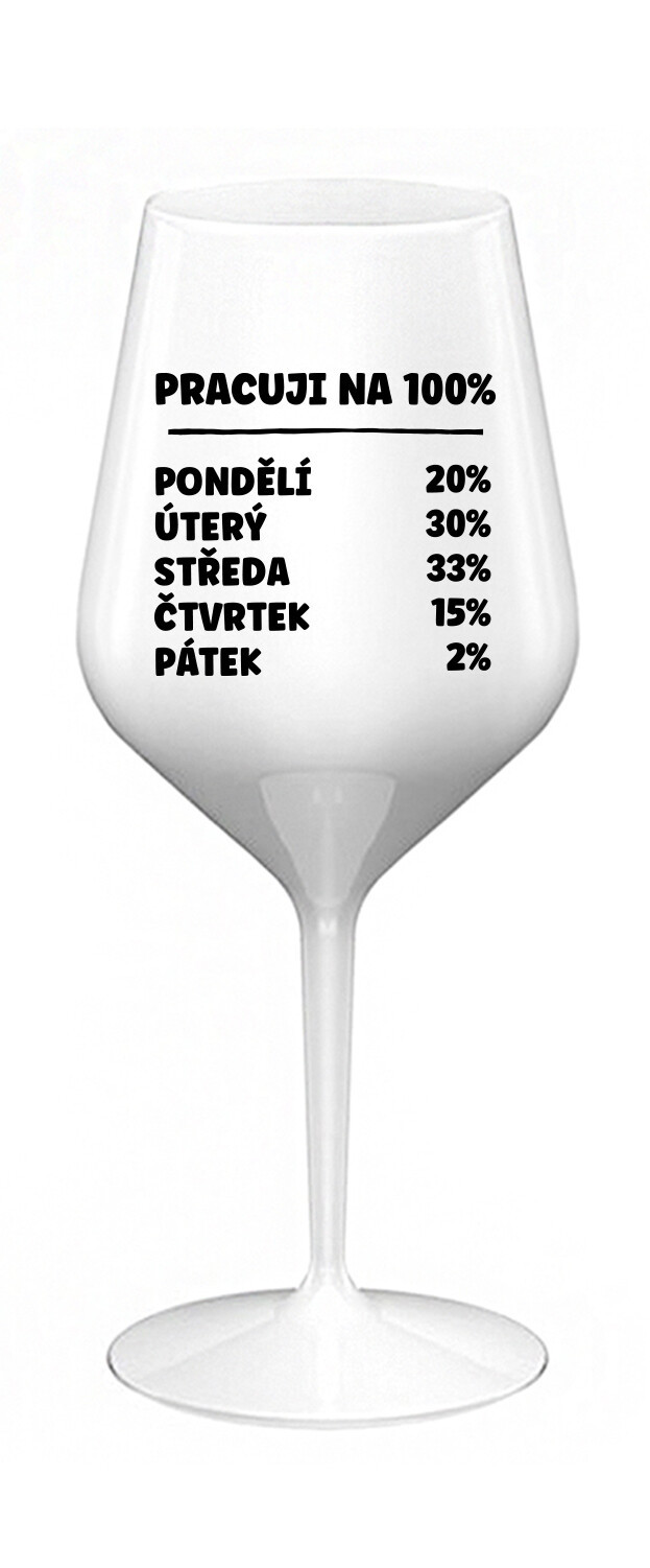 Nerozbitná bílá vinná sklenice s motivem PRACUJI NA 100% je skvělá na zahradu, pláž, výlet, piknik a parádu udělá i při kempování. Jelikož je vyrobená z kvalitního polykarbonátu je de facto nerozbitná. Je to luxusní kousek, s nímž si víno můžete vychutnat prostě kdekoliv. Mají ergonomický tvar, který příjemně padne do ruky a protože je lehká, usnadňuje to její přenášení. Je snadno skladovatelná a lehce se čistí. Díky svému designu si s ní můžete vychutnat doopravdy kdekoliv bezproblémové pití výborného vína.