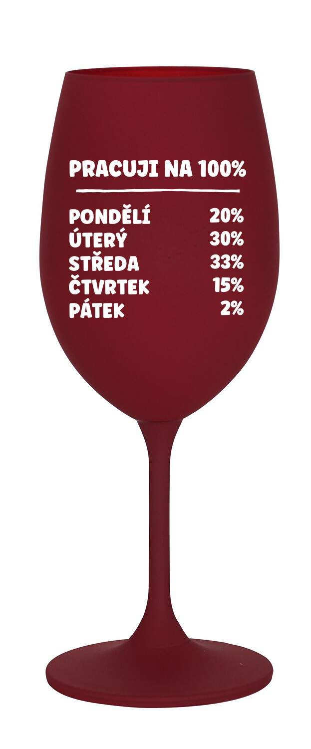 Vinná bordó sklenice s originálním motivem PRACUJI NA 100% je krásným a osobitým dárkem, které ale využijete i Vy sami třeba ve chvílích, kdy si budete chtít zpříjemnit náročný den. Tyto originální vinné sklenice jsou totiž nejen pro výjimečné události, ale i pro běžné večery, které si chcete zpříjemnit sklenkou dobrého vína. Jistě proto potěší každého milovníka vína, i toho, kdo si umí svůj život vychutnat plnými doušky.