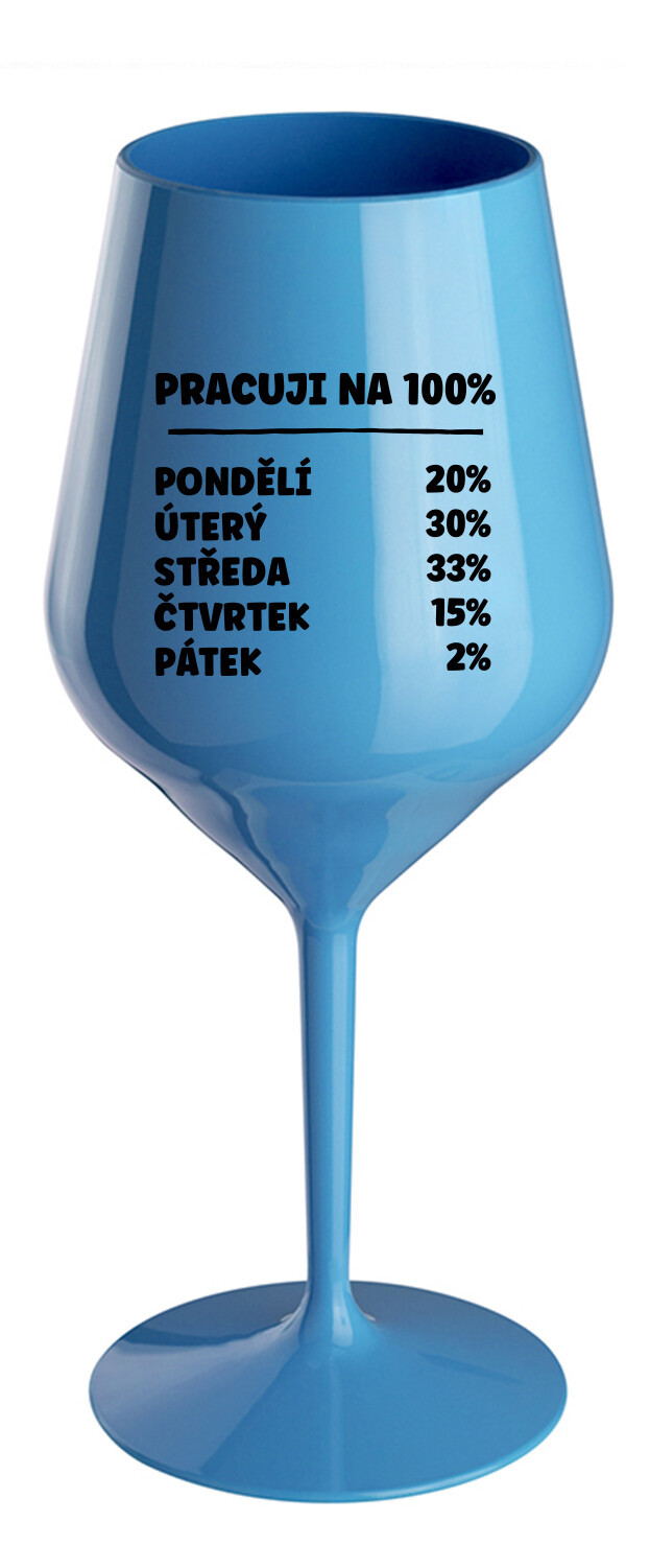 Nerozbitná modrá vinná sklenice s motivem PRACUJI NA 100% je skvělá na zahradu, pláž, výlet, piknik a parádu udělá i při kempování. Jelikož je vyrobená z kvalitního polykarbonátu je de facto nerozbitná. Je to luxusní kousek, s nímž si víno můžete vychutnat prostě kdekoliv. Mají ergonomický tvar, který příjemně padne do ruky a protože je lehká, usnadňuje to její přenášení. Je snadno skladovatelná a lehce se čistí. Díky svému designu si s ní můžete vychutnat doopravdy kdekoliv bezproblémové pití výborného vína.