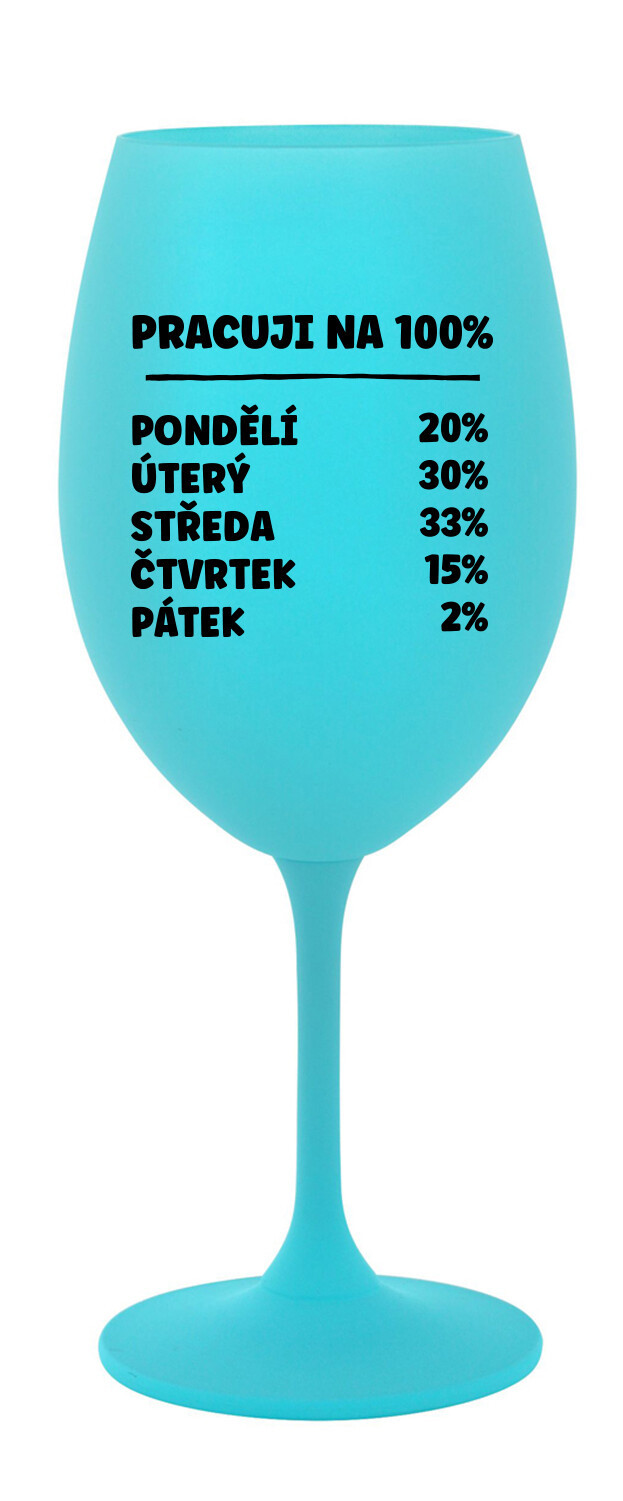Vinná tyrkysová sklenice s originálním motivem PRACUJI NA 100% je krásným a osobitým dárkem, které ale využijete i Vy sami třeba ve chvílích, kdy si budete chtít zpříjemnit náročný den. Tyto originální vinné sklenice jsou totiž nejen pro výjimečné události, ale i pro běžné večery, které si chcete zpříjemnit sklenkou dobrého vína. Jistě proto potěší každého milovníka vína, i toho, kdo si umí svůj život vychutnat plnými doušky.