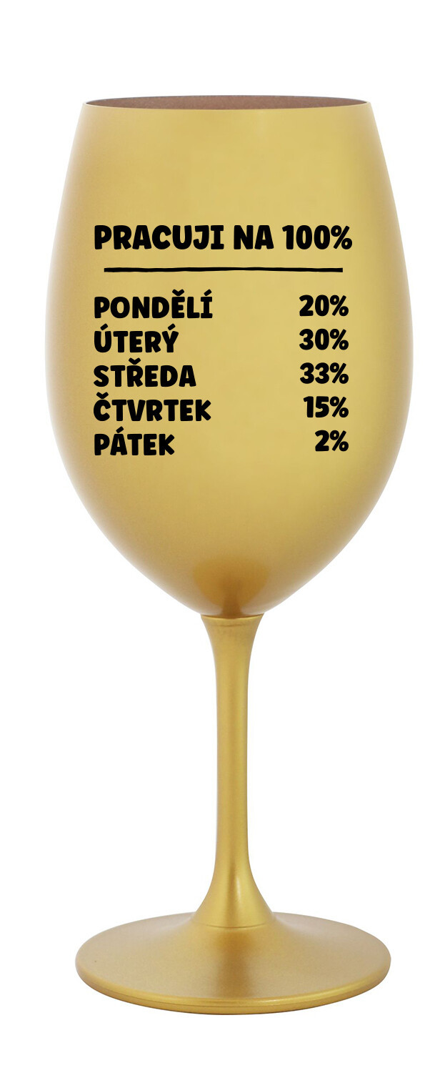 Vinná zlatá sklenice s originálním motivem PRACUJI NA 100% je krásným a osobitým dárkem, které ale využijete i Vy sami třeba ve chvílích, kdy si budete chtít zpříjemnit náročný den. Tyto originální vinné sklenice jsou totiž nejen pro výjimečné události, ale i pro běžné večery, které si chcete zpříjemnit sklenkou dobrého vína. Jistě proto potěší každého milovníka vína, i toho, kdo si umí svůj život vychutnat plnými doušky.