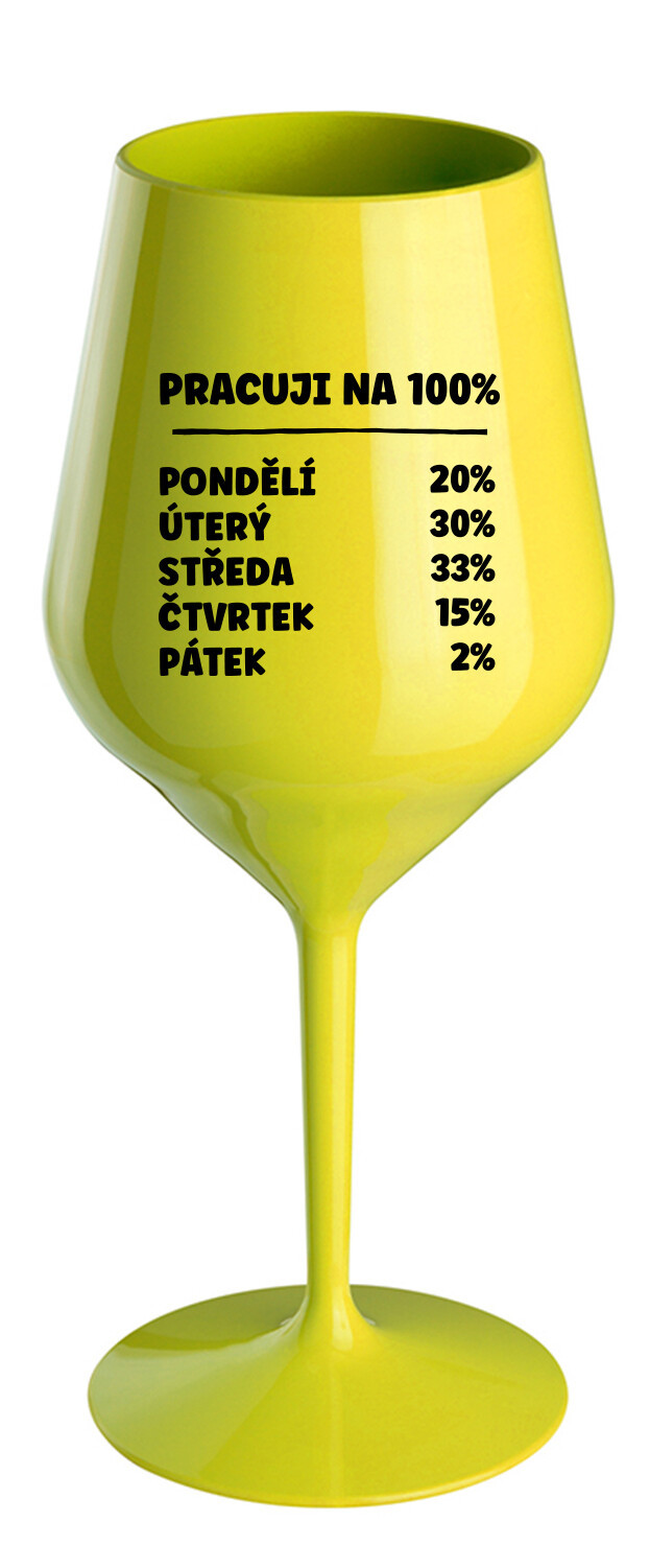 Nerozbitná žlutá vinná sklenice s motivem PRACUJI NA 100% je skvělá na zahradu, pláž, výlet, piknik a parádu udělá i při kempování. Jelikož je vyrobená z kvalitního polykarbonátu je de facto nerozbitná. Je to luxusní kousek, s nímž si víno můžete vychutnat prostě kdekoliv. Mají ergonomický tvar, který příjemně padne do ruky a protože je lehká, usnadňuje to její přenášení. Je snadno skladovatelná a lehce se čistí. Díky svému designu si s ní můžete vychutnat doopravdy kdekoliv bezproblémové pití výborného vína.