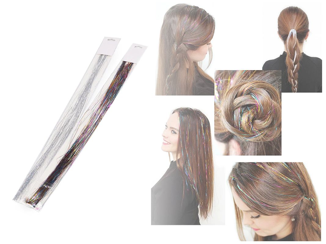 Třpytivý pramen z lesklých lamel do vlasů nadchne malé i velké parádnice. Skvěle oživí karnevalový účes, hodí se na různé party apod. Uprostřed je pramen zpevněný drátkem, kterým se může připevnit ke gumičce, sponce nebo skřipečku. Pramen je krásný i vpletený do účesu. Délka: cca 47 cm Šířka: cca 2,5 cm