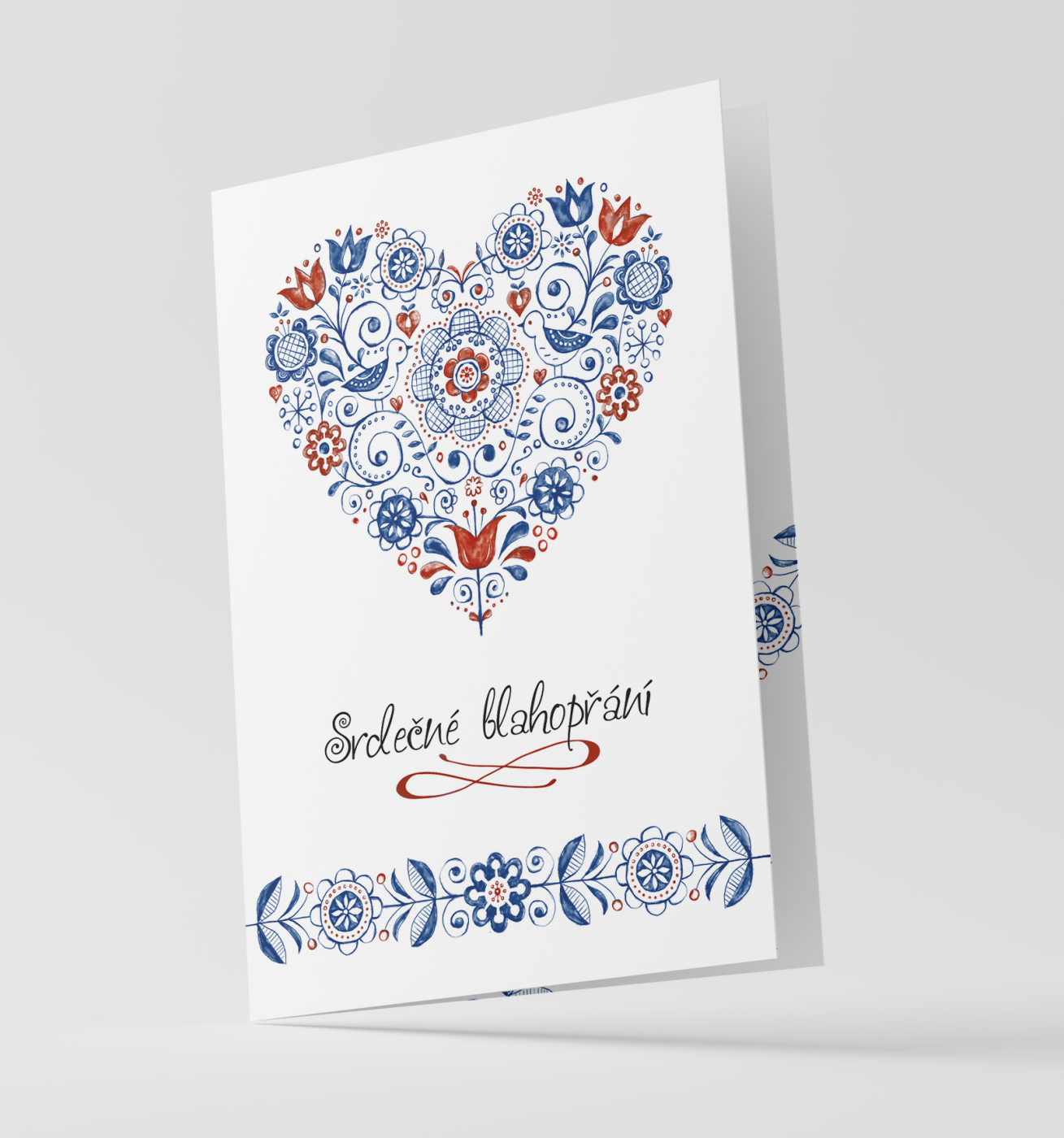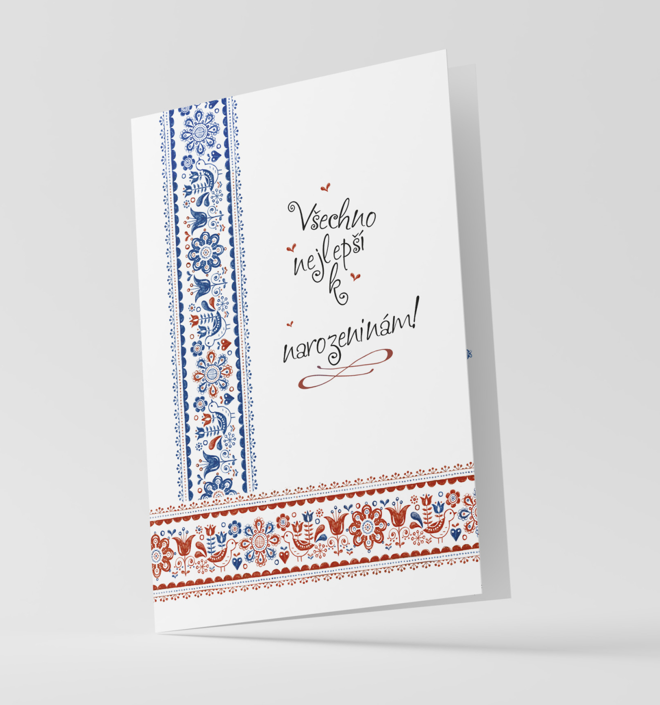 Blahopřání novomanželům, k narozeninám a svátku s tradičním ornamentem s bílou obálkou.Přání je vevnitř zdobeno ornamentem. Nemá žádný předepsaný text.