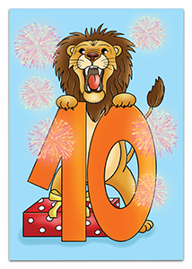 Blahopřání k 10.narozeninám se lvem. Přání je vevnitř zdobeno motivy z titulní strany s textem Všechno nejlepší k narozeninám!. Baleno v bílé obálce. Rozměr 19,5x13,5cm.