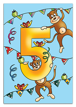 Blahopřání k 5.narozeninám s opičkami. Přání je vevnitř zdobeno motivy z titulní strany s textem Všechno nejlepší k narozeninám!. Baleno v bílé obálce. Rozměr 19,5x13,5cm.