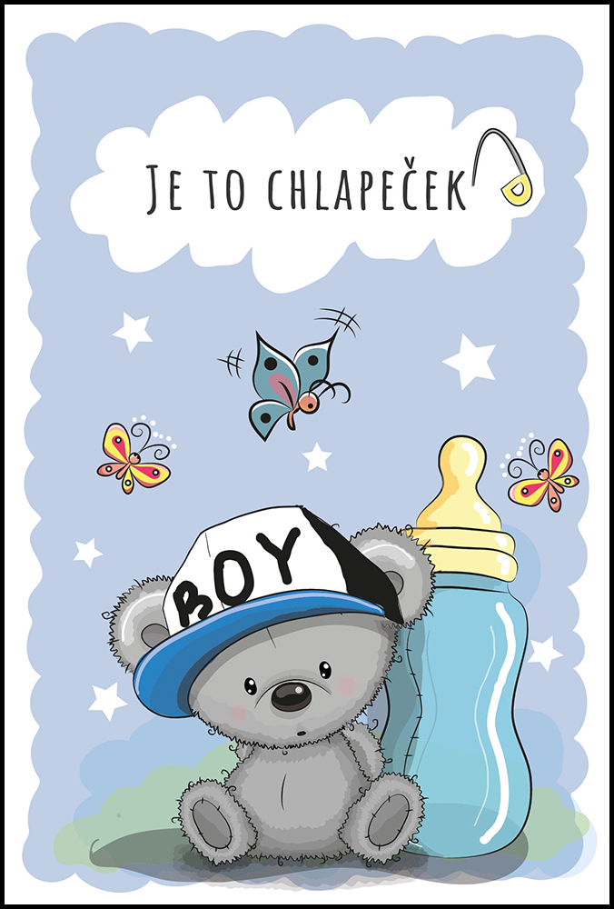 Krásné blahopřání k narození chlapečka s textem na titulce Je to chlapeček. Vnitřní strana je ozdobena hvězdičkami na modrém podkladu s textem: Blahopřejme k narození krásnéhochlapečka. Ať životem ho provází radost, štěstí, zdraví a plná náruč lásky. Není baleno v igelitu, součástí balení je bílá obálka, rozměr 17x11,5cm.