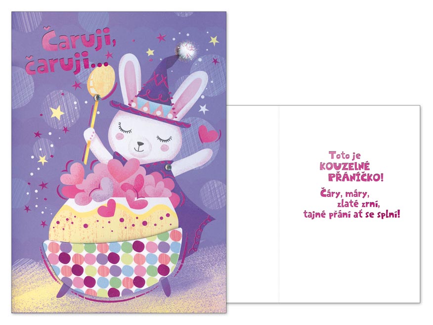 Přání k narozeninám králíček Veselé dětské přání s textem a s obrázkem králíčka zajisté potěší každou dětskou duši.Text na přední straně přání:Čaruji, čaruji...Text uvnitř přání:Toto je kouzelné přáníčko!Čáry, máry, zlaté zrní,tajné přání ať se splní!Nápis je ražený růžovou folií, součástí přání je obálka.