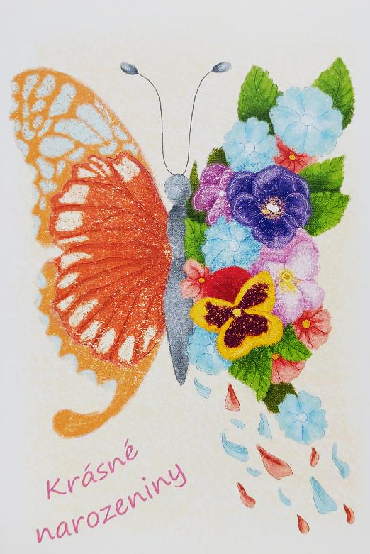 Detailně kreslené blahopřání s textem na titulce Krásné narozeniny s obrázkem motýla a květin, určitě udělá mnouhem větší radost nez zaslaná sms. Přání je vevnitř zdobeno motivem z titulní strany s textem: Ať je Tvůj život jako tanec motýla mezi květinami- plný krásy, lehkosti a barevných radostí! Baleno v bílé obálce. Rozměr 17x11,5 cm.