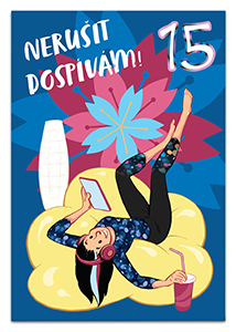 Vtipné blahopřání k 15. narozeninám. Přání je vevnitř zdobeno motivy z titulní strany. Nemá předepsaný text. Baleno v bílé obálce. Rozměr 19,5x13,5 cm.