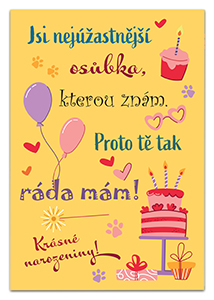 Blahopřání k narozeninám. Přání je vevnitř zdobeno barevnými motivy z titulní strany s textem Všechno nejlepší!. Baleno v bílé obálce. Rozměr 19,5x13,5cm.