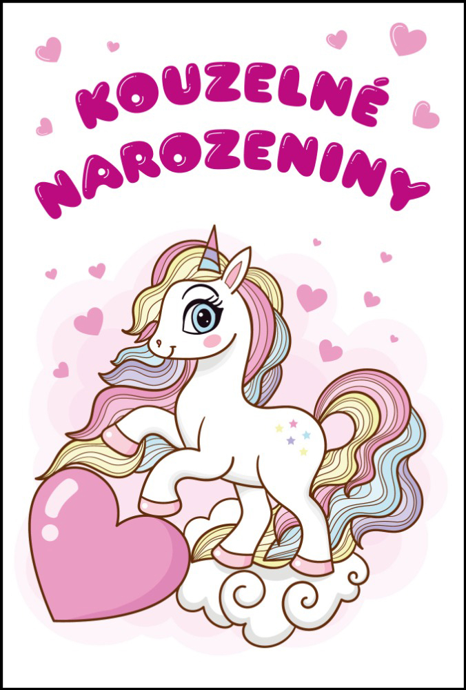 Kouzelné přání k narozeninám pro malé slečny s textem na titulce Kouzelné narozeniny. Vnitřní strana je ozdobena srdíčky s textem: Hodně štěstí, všechno nej, celý den se usmívej. Není baleno v igelitu, současí je bílá obálka, rozměr 17x11,5cm.