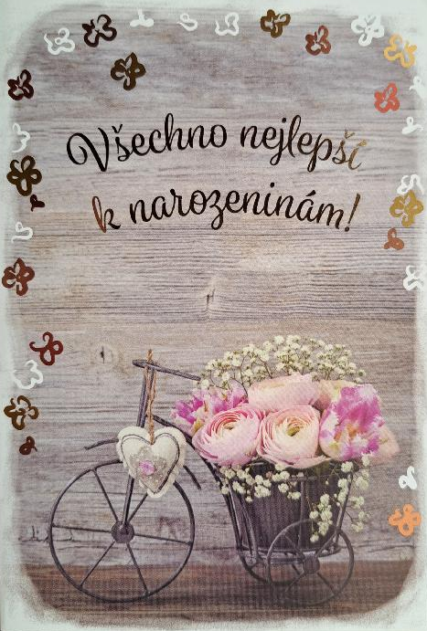 Blahopřání k narozeninám s textem na titulce Všechno nejlepší k narozeninám! Zdobeno zlatým potiskem. Přání je vevnitř zdobeno motivem z titulní strany a textem: Ať je tvůj život jako jízda na kole mezi rozkvetlými loukami - plný krásy, radosti a nezapomenutelných okamžiků! Baleno v sáčku, součástí je bílá obálka. Rozměr 17x11,5cm.