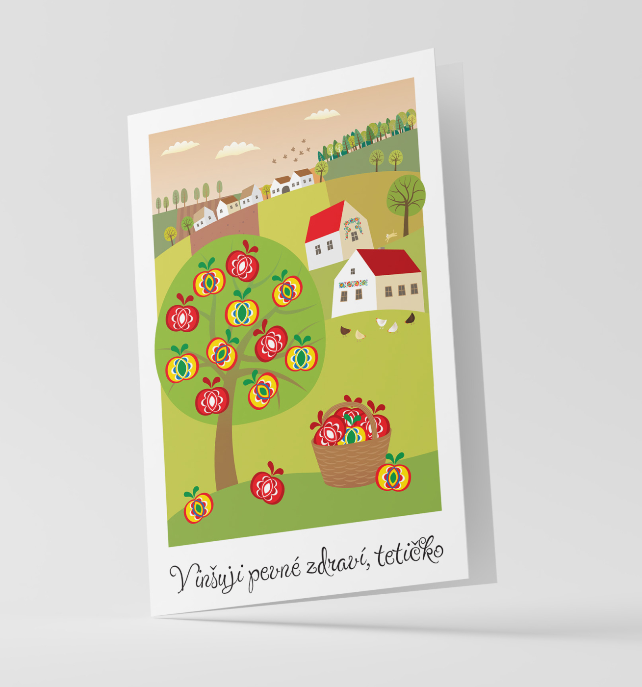 Malované přání Tož na tvoje zdraví, strécu s vinnými sklepy, zdobené tradičnímy ornamenty a bílou obálkou.Přání je vevnitř zdobeno ornamentem na levé straně. Nemá žádný předepsaný text.