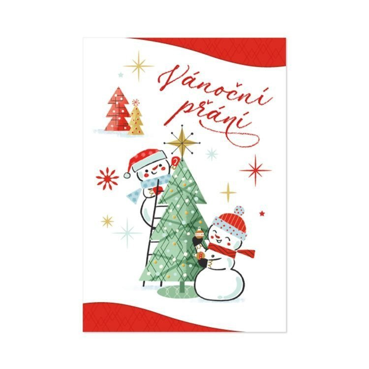 Veselé vánoční přáníčko s milým textem a netradičním tvarem titulní strany Rozměry přání: 13,5 × 19,5 cm Text uvnitř přání: Radujme se, veselme se, buďme všichni stále spolu, vždyť jsou tu zas po roce ty nejkrásnější Vánoce!