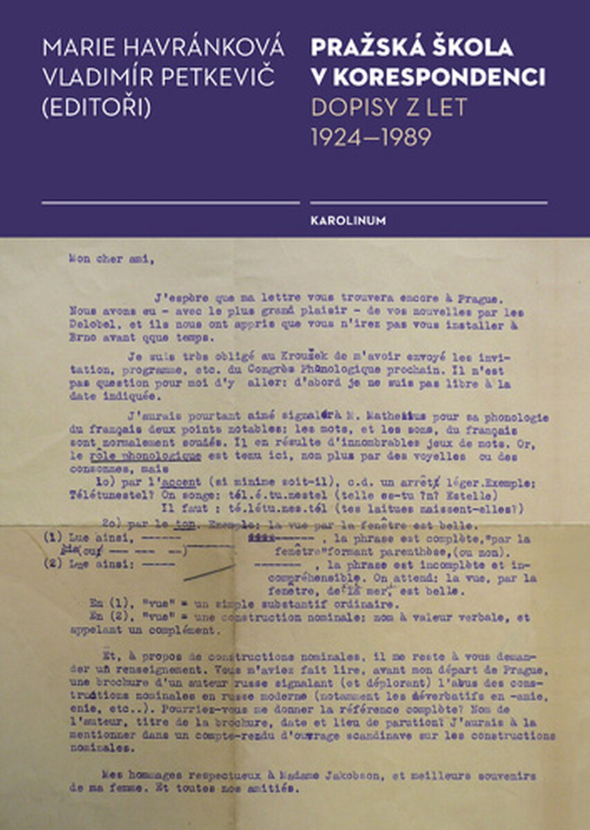 Pražská škola se stala ve světové lingvistice 20. století pojmem: na základě Kurzu moderní lingvistiky Ferdinanda de Saussura a z poznatků ruského formalismu spoluutvářela a šířila strukturalismus jako moderní, dynamický směr bádání jak v lingvistice, tak v literární vědě. Její představitelé, zakládající členové Pražského lingvistického kroužku (1926–1952) Vilém Mathesius, Bohuslav Havránek, Roman Jakobson, Jan Mukařovský a Bohumil Trnka pořádali odborné přednáškové schůze, vydali řadu publikací i s mezinárodní účastí (především Travaux du Cercle linguistique) a zúčastnili se také široké vědecké diskuse na celoevropských kongresových setkáních. V Kroužku přednášela řada zahraničních učenců.Svazek korespondence Pražské školy se tematicky dotýká celé této činnosti spolku. Představuje epistolární klenoty domácích i zahraničních vědců nebo českých avantgardních umělců, adresovaných zakládající pětici vědců. Ve výboru 581 dopisů psaných ve světových i dalších slovanských jazycích přináší to nejcennější, co se v dopisech k vědeckému odkazu školy uchovalo. Pozoruhodné jsou především dopisy od lingvistů Kodaňské školy (29 dopisů od Louise Hjelmsleva) a Ženevské školy; z domácích pak dopisy Mathesiovy, které psal svým žákům, rozsáhlá korespondence Josefa Vachka, Felixe Vodičky a René Wellka. Trpký osud strukturalistů po druhé světové válce dokumentují vedle Vachkových dopisů adresovaných Havránkovi i další jemu určené dopisy Alexandra Isačenka a Ľudovíta Nováka. Cizojazyčné dopisy jsou publikovány v originálním znění i v překladu.