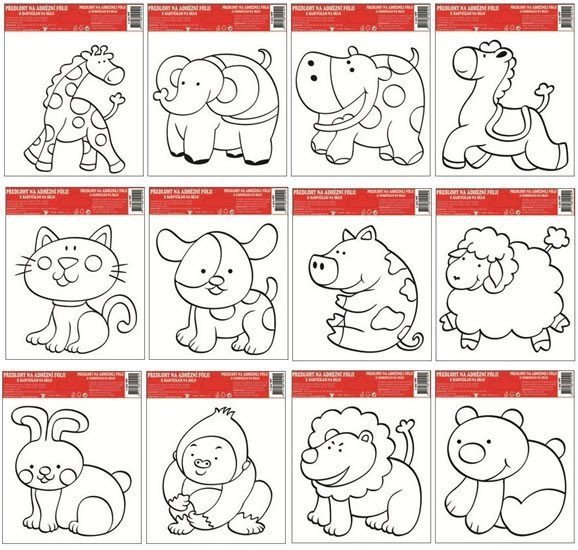 Předlohy na malování na sklo s vyvýšenou konturou zvířátka 12 motivů, 17x14cm ADHÉZNÍ FÓLIE ELEKTROSTATICKY PŘILNE K POVRCHU! Vybarvěte a po uschnutí umístěte na čisté, případně navlhčené sklo, zrcadlo, apod... Můžete vybarvit: barvičkami na sklo, fixami, vodovými barvam,i apod.