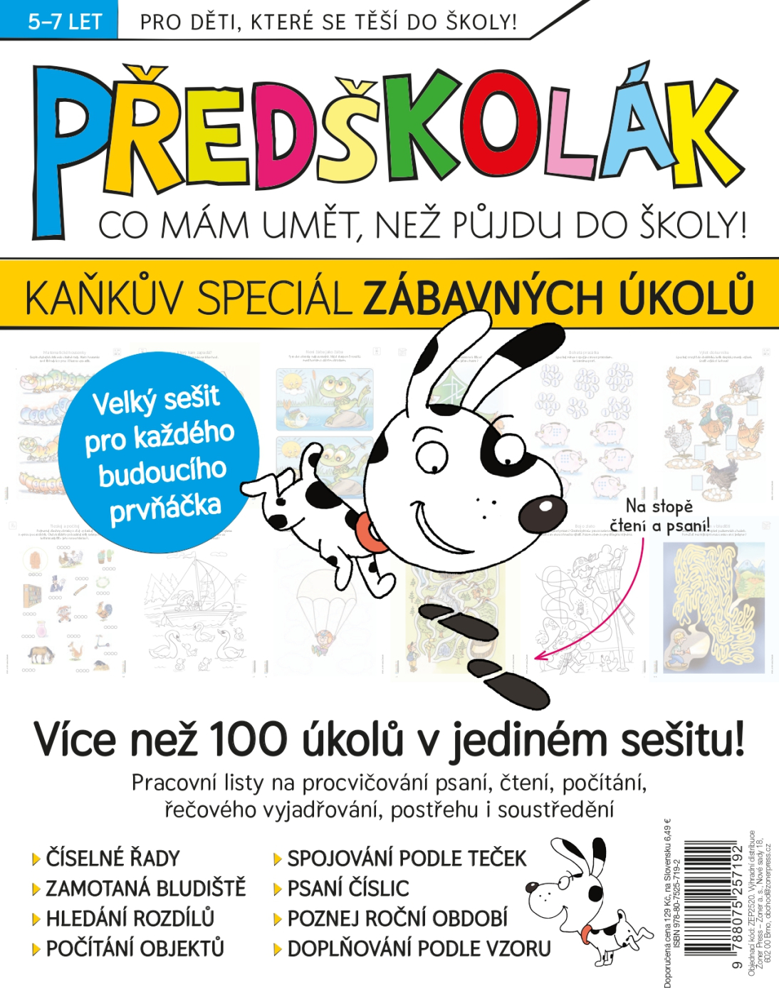 Více než 100 úkolů v jediném sešitu! Pracovní listy na procvičování psaní, čtení, počítání, řečového vyjadřování, postřehu i soustředění. Kaňkův speciál zábavných úkolů rozhodně potřebuje každý budoucí školák a školačka. U babičky, ve vlaku, na táboře, doma, prostě kdekoli vás napadne, můžete procvičovat to, co by měl každý prvňák zvládnout levou zadní! Zdraví vás pes Kaňka, packu na to, haf! Číselné řady Zamotaná bludiště Hledání rozdílů Počítání objektů Spojování podle teček Psaní číslic Poznej roční období Doplňování podle vzoru