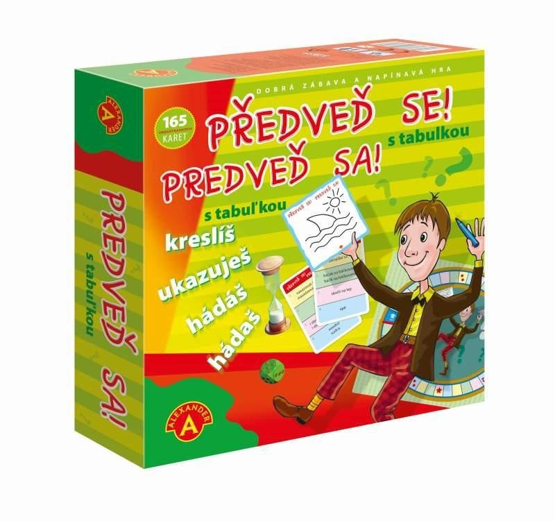Ve společenské párty hře „PŘEDVEĎ SE! (s tabulkou)“ vyhrává skupina 2-16 hráčů od 7 let, jejíž členové dokáží co nejlépe vystihnout kresbou, ale také uhodnout vylosované slovo nebo pojmy z karty. Ve společenské párty hře „PŘEDVEĎ SE! (s tabulkou)“ vyhrává skupina hráčů, jejíž členové dokáží co nejlépe vystihnout kresbou, ale také uhodnout vylosované slovo nebo pojmy z karty. Hra je určena pro děti i dospělé a může být prostředkem, jak prožít skvělou rodinnou zábavu plnou humoru. PŘEDVEĎ SE! (s tabulkou) je společenská zábavná hra, ve které je nutné co nejrychleji uhodnout náhodně vybrané slovo znázorněné pomocí obrázku na kreslicí tabulce. Průběh hry vytváří neobyčejnou atmosféru rodinné zábavy, plnou humoru a napětí. V této hře vítězí ti, kteří díky své fantazii a rychlému úsudku dokážou co nejlépe vystihnout kresbou, ale také uhodnout vylosované slovo nebo pojem z karty. Prezentovaná a hádaná témata jsou: Aktivity, Předměty, Pořekadlo/Název, Osoba/Zvíře Ke hře je přibalena tabulka s mazacím povrchem a speciální fix, takže už nikdy nebudete shánět papíry a tužky, aby jste mohli rozjet skvělou zábavu. Balení obsahuje:1) oboustranné karty zadání-163ks, 2) karty "kategorie"-2ks, 3) hrací desku, 4) figurky-4ks, 5) hrací kostku, 6) žetony-80ks, 7) stírací tabulku, 8) mazací fix, 9) stírací houbičku, 10) přesýpací hodiny, 11) český a slovenský návod ke hře